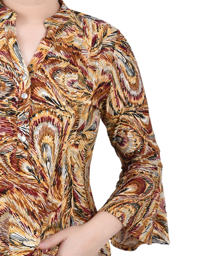 Multi Grey Peacock 3/4 Bell Sleeve Pleat Front Y Neck Top