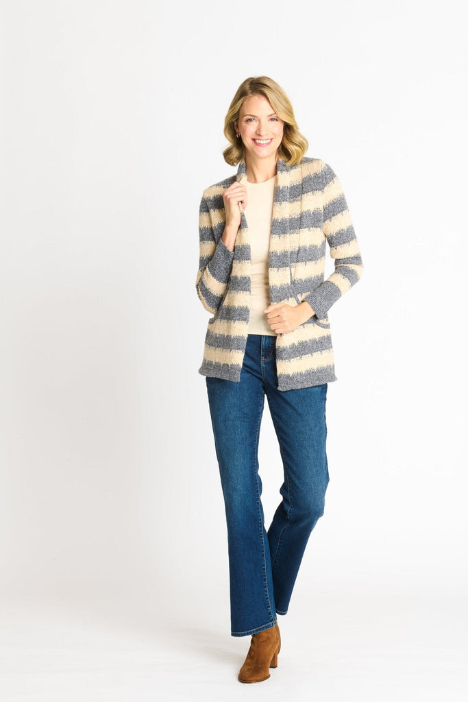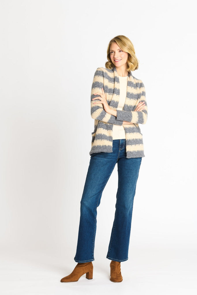 The Wave Stripe J-Pocket Cardigan Sweater in Light Heather combines style and functionality with its chic wave stripe design and practical j-pockets. This lightweight cardigan is perfect for layering and versatility to any outfit.
