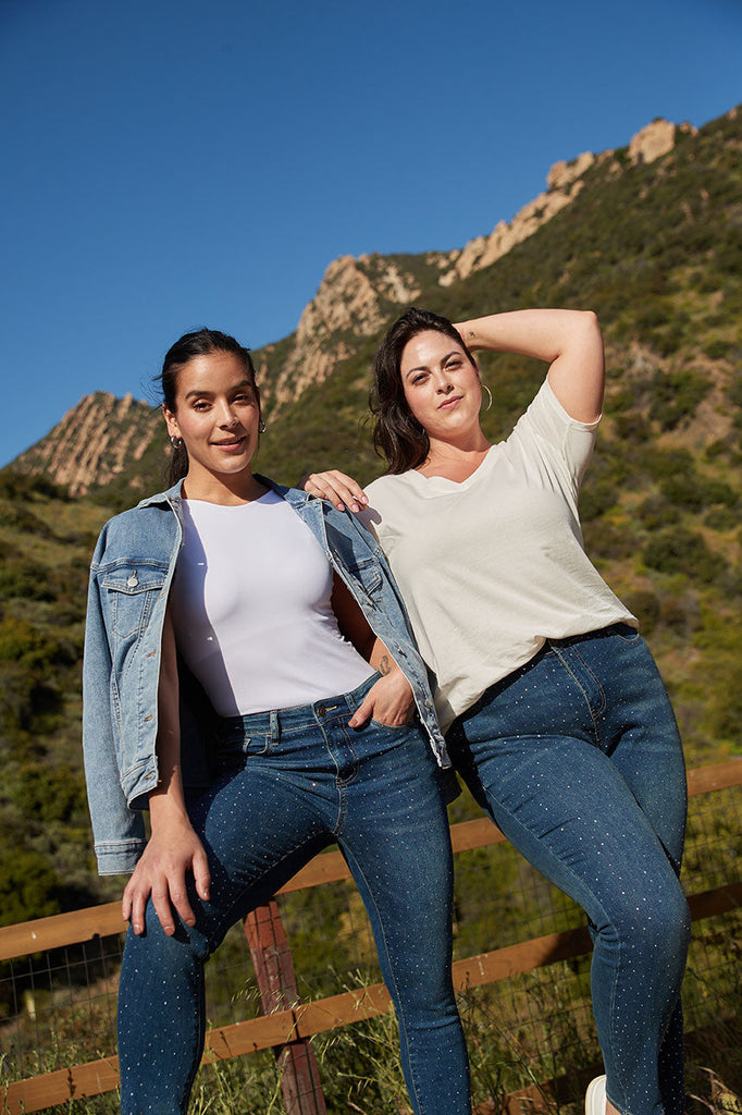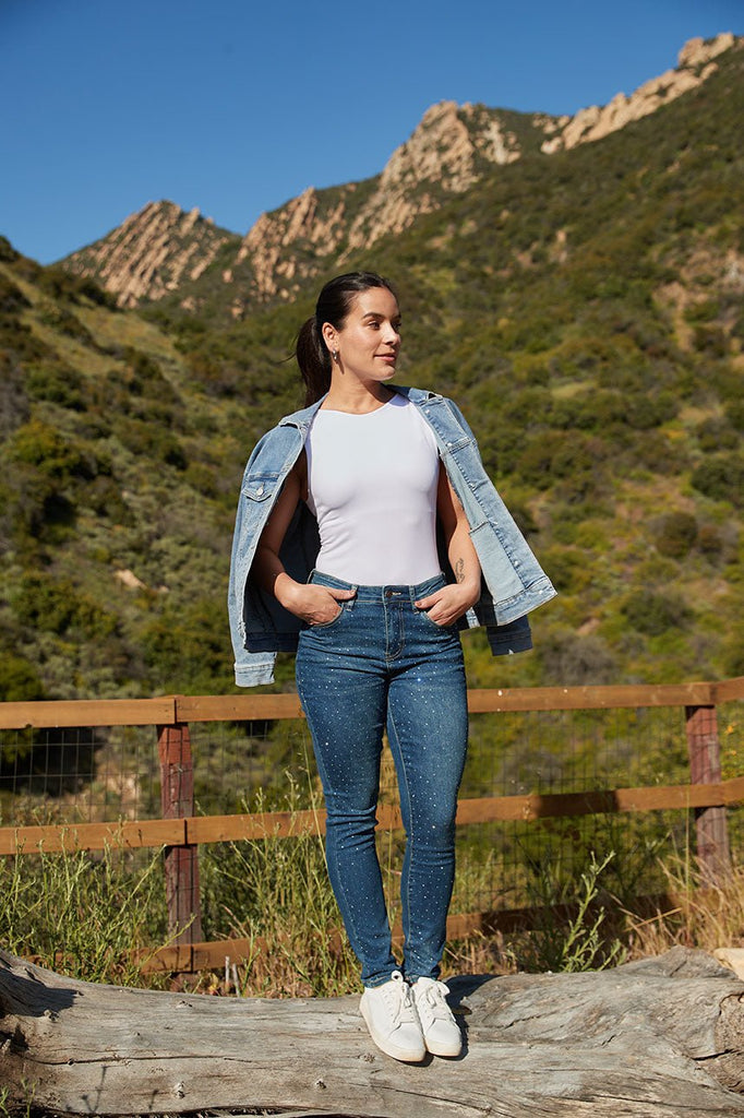 Crafted with a comfortable stretch denim, these skinny jeans offer a flattering fit that hugs your curves in all the right places. The rhinestone embellishments add just the right amount of sparkle, catching the light with every step you take.
